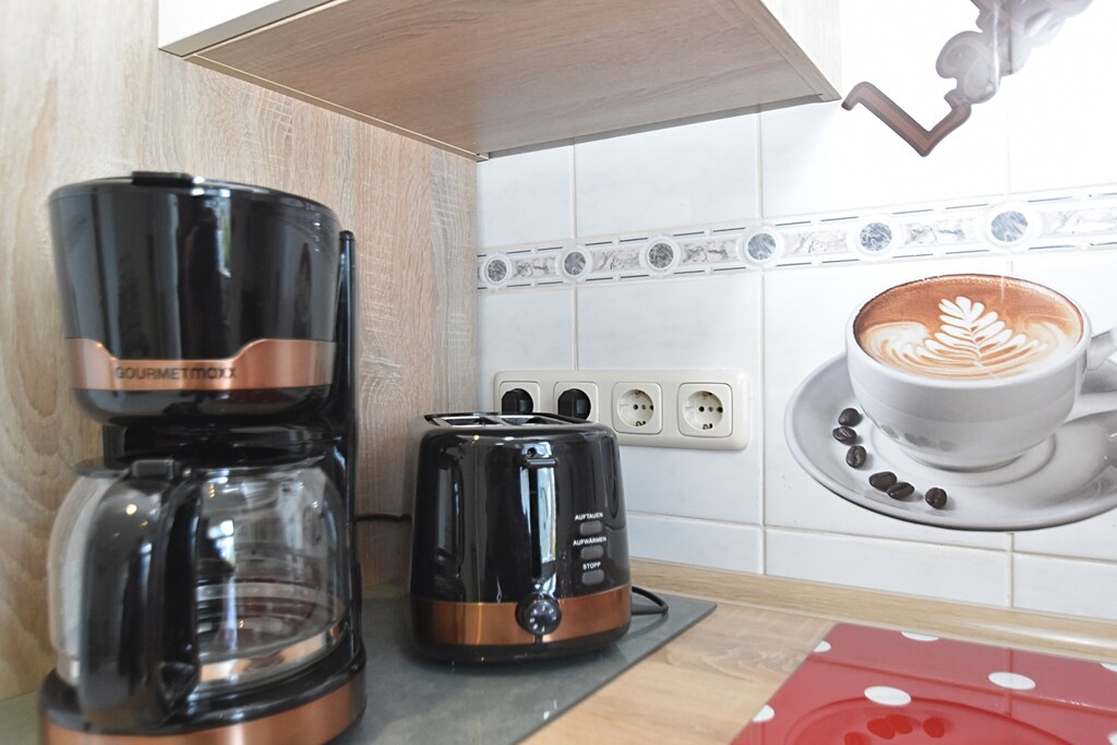 Grille-pain, Plaque de cuisson (vitrocéramique, 4 foyers), Cafetière/percolateur (filtre), Four, Lave-vaisselle, Réfrigérateur (+ congélateur)