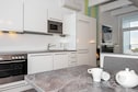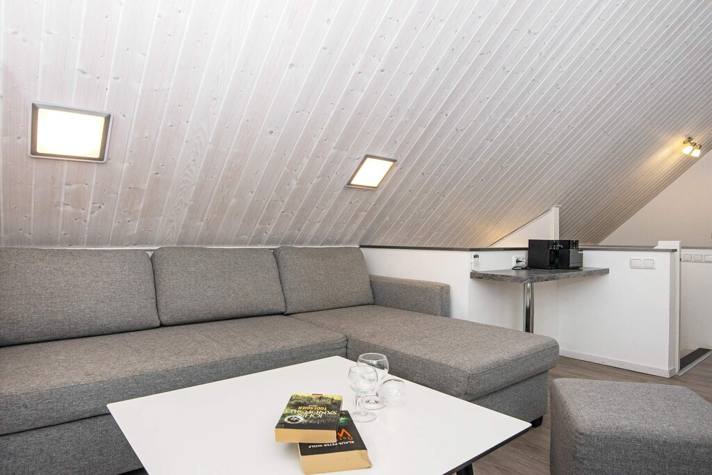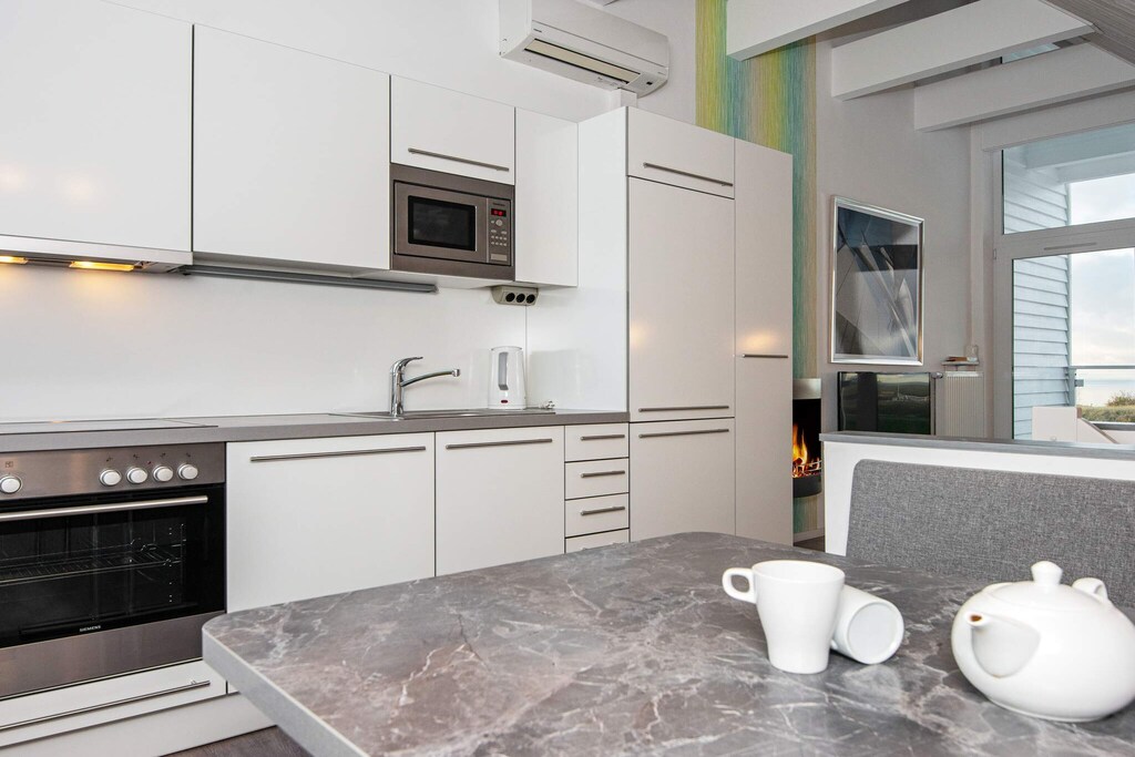 Im Obergeschoss ist der lichtdurchflutete Wohnbereich das Herzstück des Hauses. Kochen Sie gemeinsam in der gut ausgestatteten Küche, machen Sie es sich mit einem Film am Bioethanol-Kamin gemütlich oder genießen Sie von der Loggia aus den Panoramablick auf Deich, Strand und vorbeifahrende Schiffe. Ein Fernglas steht für einen genaueren Blick bereit. Moderne Annehmlichkeiten wie Flachbildfernseher, Blu-ray-Player, Musikanlage und Highspeed-Glasfaser-WLAN sorgen dafür, dass Sie sich wie zu Hause fühlen.