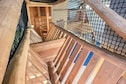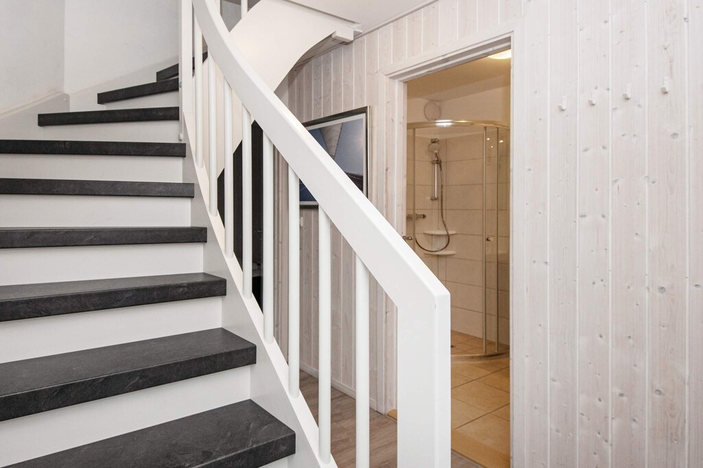 Das zweistöckige Haus vereint Komfort mit Stil. Im Erdgeschoss befinden sich zwei einladende Schlafzimmer und ein Badezimmer mit Fußbodenheizung sowie eine private Sauna – ideal zum Entspannen nach einem Tag im Freien. Sowohl vom Flur als auch von den Schlafzimmern aus gelangen Sie direkt auf die Terrasse, wo Sie jeden Morgen die frische Seeluft umweht.