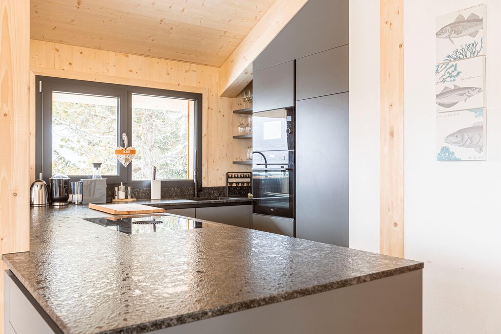 La cuisine ouverte est entièrement équipée avec 4 plaques électriques, un réfrigérateur avec congélateur, un four et un micro-onde ainsi qu'une machine à café, une bouilloire et bien plus encore. Un autre point fort est le balcon spacieux avec vue sur les montagnes. Il y a également plusieurs places de parking autour de la maison.