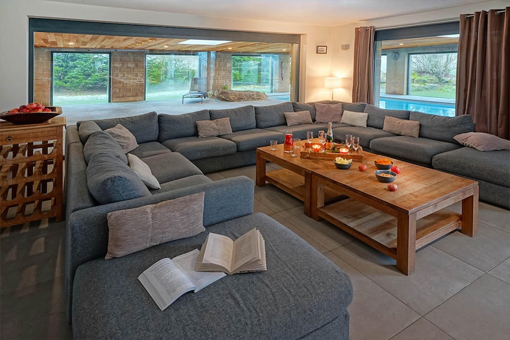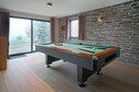 een ruime aangename living met biljart, en zicht op het zwembad en brubbelbad