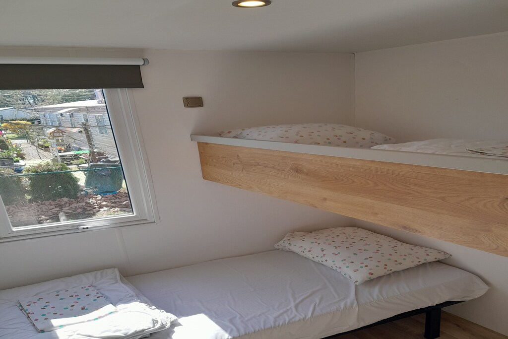 Le chalet dispose de trois chambres accueillantes : une avec un lit double, une autre avec deux lits simples ou un lit double, et une troisième avec un lit simple et un lit superposé en mezzanine, idéale pour les enfants ou les invités supplémentaires. La salle de bain privative comprend une douche, un lavabo et des toilettes. À l'extérieur, détendez-vous sur votre terrasse privée avec mobilier de jardin ou explorez les sentiers de promenade verdoyants du parc. Rafraîchissez-vous dans la piscine commune en juillet et août, ouverte de 12h à 18h, idéale pour les après-midi ensoleillés.