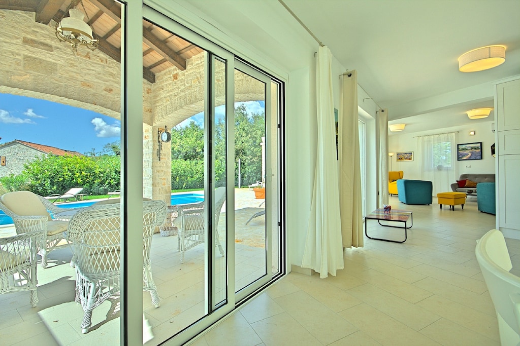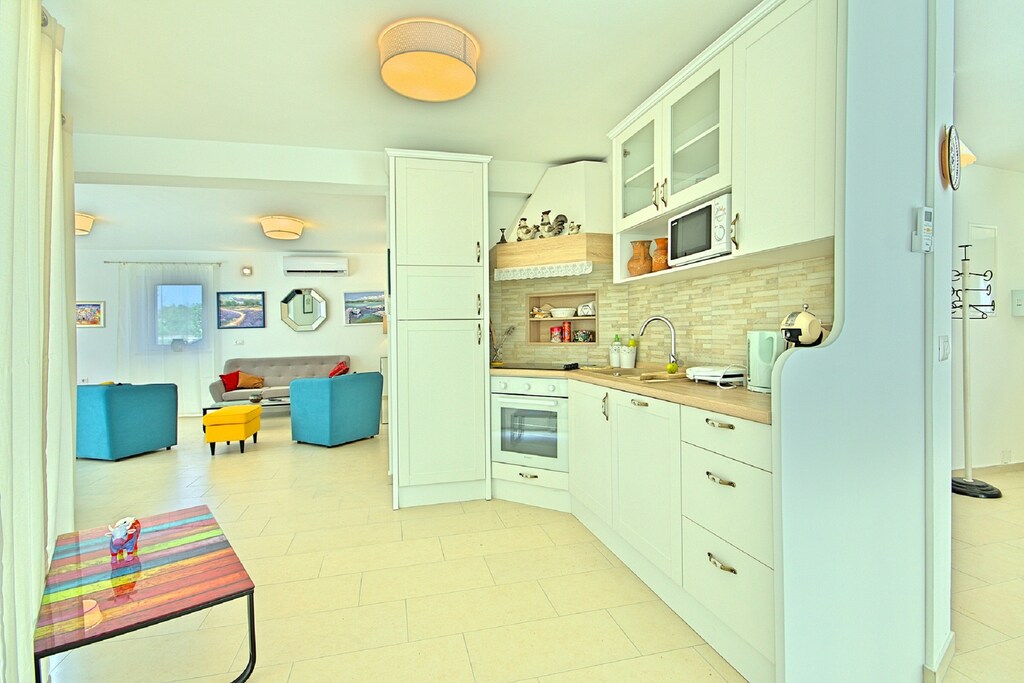 We were 5 adults and a dog. The house is very spacious and fully equipped for 8 people. Everything is available in the kitchen. Toaster, microwave, even a "magic wand". It's just a pity that the espresso machine was missing. However, a filter coffee machine was available. The property is open on one side to the neighbouring property. This probably belongs to the house owners as there is only a tool shed and a small house. We did not see anyone here during our 2-week stay, so that did not bother us. However, it would have been a bit "unfortunate" if someone had also lived there, as then our dog would not have been able to move around so freely. So he could also use the neighbouring property at the same time 🤭. After a week, the bed linen and towels were changed. The pool was also checked twice 👍👍. It is also very good that there is a really recommendable "konoba" right next to the villa. After very good food and free "grappa tasting" (self-distilled by the landlord himself), this has enormous advantages 😉. Not so goid: Unfortunately, there was no espresso machine as listed in the description. We also could not discover the bicycles. It is also a bit unfortunate that there is only one small table with 4 armchairs for the outdoor terrace. All in all it was a beautiful house and we would love to come back again sometime. 👍