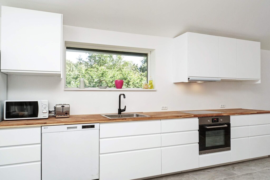 La maison dispose d'une spacieuse cuisine ouverte sur un séjour avec coin repas et salon confortable pour les réunions de famille. La pièce, dotée d'un plafond voûté jusqu'au faîte, est baignée de lumière naturelle par de grandes baies vitrées panoramiques. De là, vous accédez directement à une belle et grande terrasse, idéale pour profiter des repas, du soleil et du calme environnant.