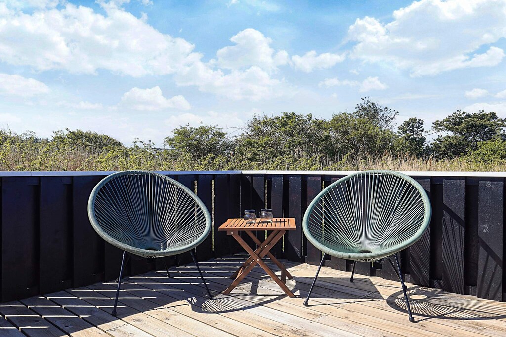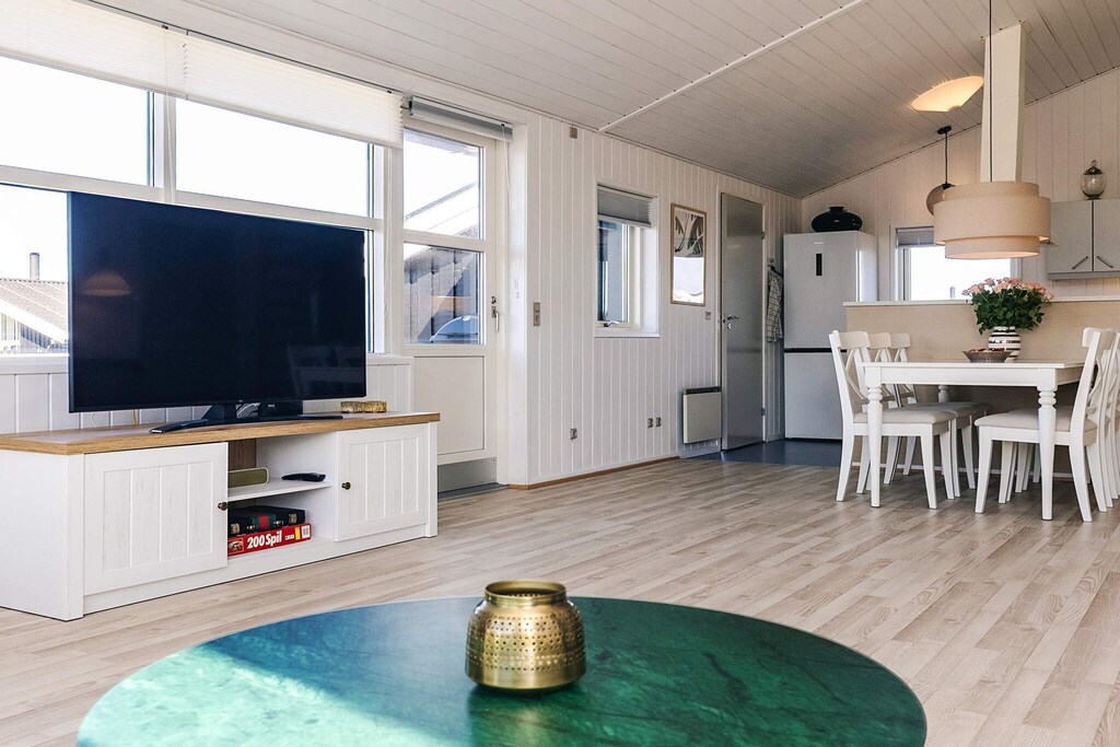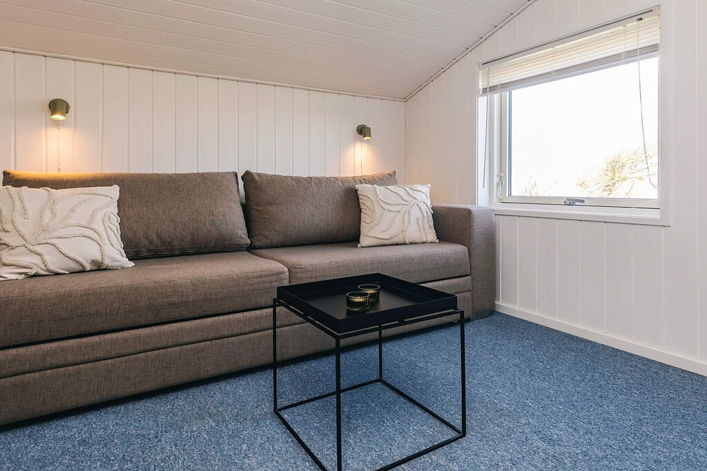 Depuis le hall d'entrée, vous accédez à un salon chaleureux et lumineux, à l'atmosphère authentique d'une maison d'été. Ce salon est relié à la cuisine. Vous y trouverez un espace pour regarder un bon film ou jouer à des jeux de société, ainsi qu'une mezzanine où les enfants peuvent jouer. Le salon dispose également d'un poêle à bois pour les fraîches journées de printemps et d'automne.