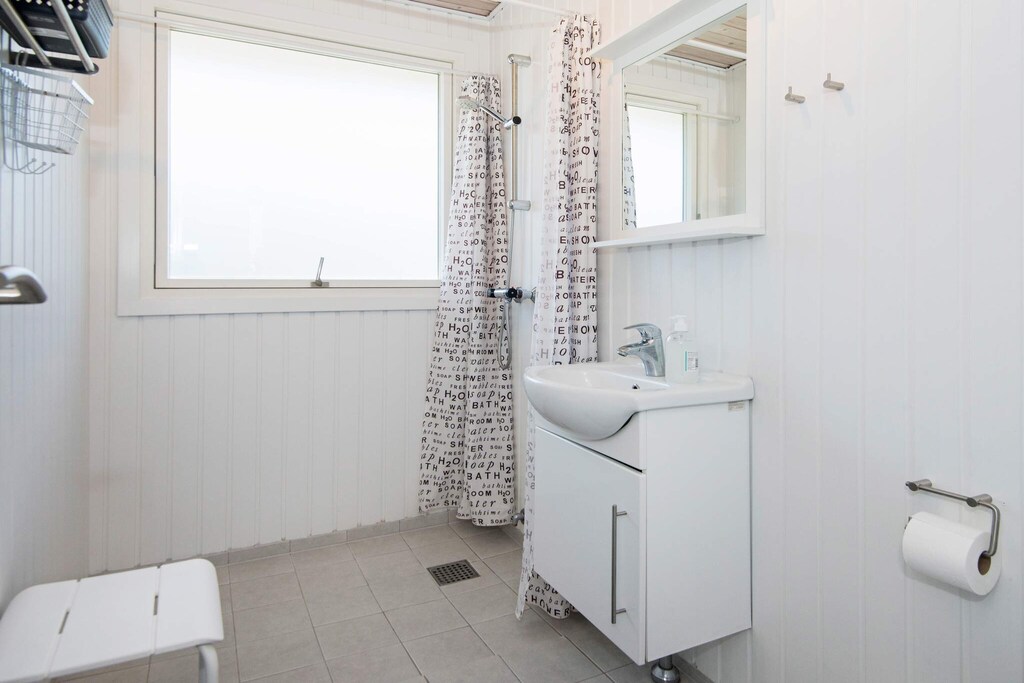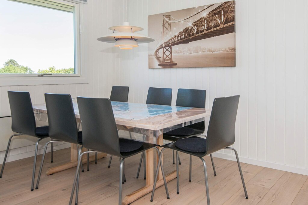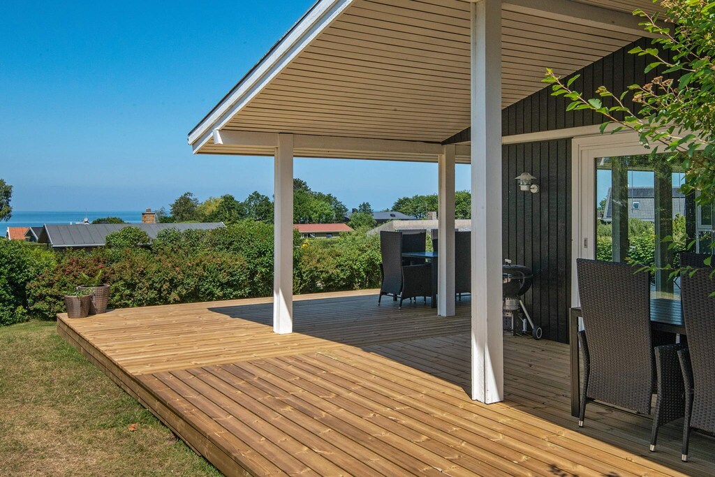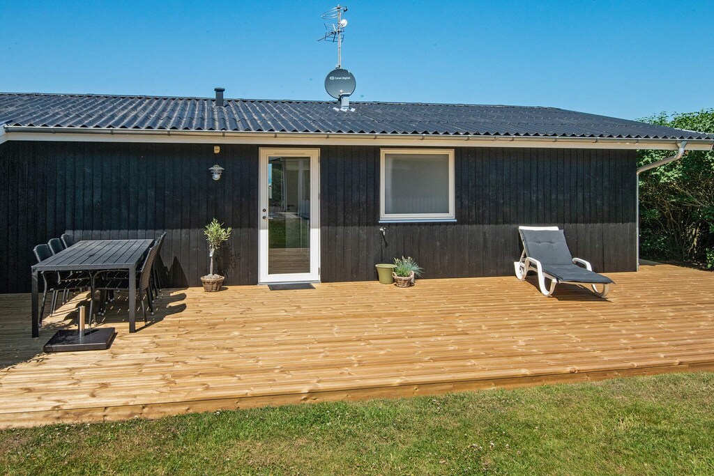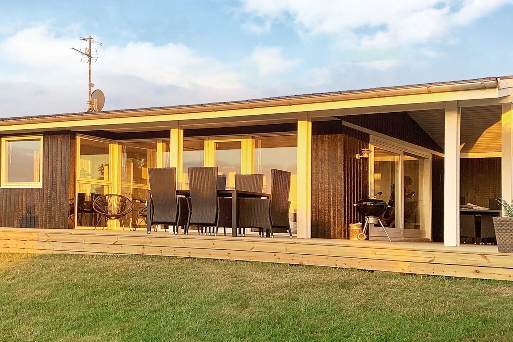 Cottage de grande hauteur avec une vue mer unique depuis la cuisine ainsi que le salon et les chambres. La maison est équipée d'une cuisine bien équipée, où vous pourrez prendre votre déjeuner depuis la salle à manger, qui est en connexion immédiate avec la cuisine. De plus, à côté de la maison se trouve un grand terrain qui invite aux jeux et aux jeux de balle. Il y a un 40 m & # 178; terrasse ouverte et un 30 m & # 178; terrasse fermée. De la terrasse, vous avez une vue fantastique sur la région et une vue sur la plage. La plage est située à env. 2 min à pied et est une plage de baignade absolument bonne. Il y a une épicerie au camping à env. 300 m de la maison.
