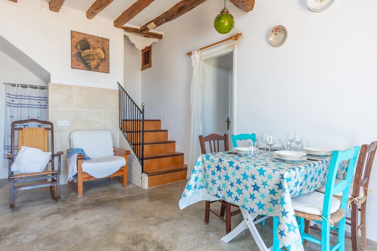 Los interiores rústicos de la casa distribuida en tres plantas, empiezan con una sala-comedor situada en la planta baja. En este espacio encontrarán una mesa en la que disfrutar de las deliciosas comidas junto a sus acompañantes. Al lado de la sala, se encuentra la cocina independiente equipada con inducción que dispone de todos los utensilios necesarios para cocinar cómodamente durante la estancia en la casa. Para completar la planta baja, hay un baño completo equipado con ducha. Subiendo por las escaleras, llegarán a la segunda sala de la casa la cual tiene las vistas perfectas hacia el mar gracias al balcón. Esta sala cuenta con una Smart TV para poder disfrutar de una tarde de pelÃculas además de un A/C para hacer más refrescante las cálidas tardes mallorquinas. En esta misma planta hay los dos dormitorios de la casa, con una cama de matrimonio y un ventilador en cada habitación. Una de las habitaciones tiene TV. Un segundo baño sin ducha da servicio a esta segunda planta. Finalmente, si viajan con un bebé se les proporcionará cuna y trona. La casa dispone de lavadora, plancha y tabla de planchar que pueden hacer uso durante la estancia.