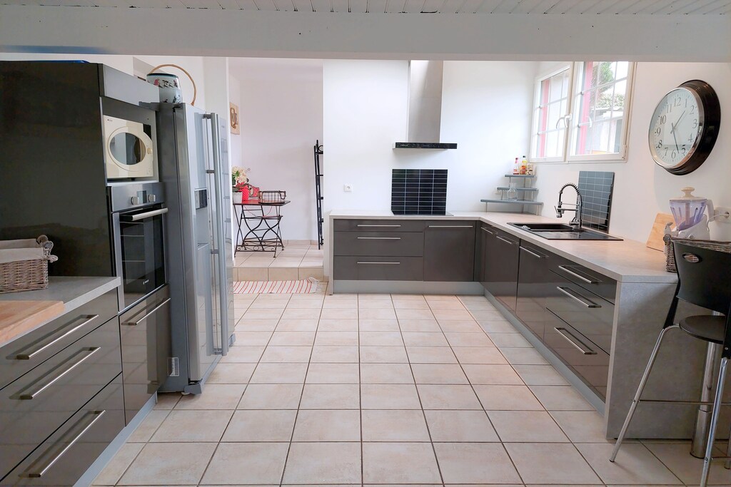 Insgesamt nicht zu empfehlen! Eine Ruine!!! 1. Check in nur zwischen 16 und 19 Uhr, wir kamen erst 19.30 an da teilte uns der Vermieter mit er hätte jetzt keine Zeit mehr, muss man sich mal vorstellen! Erst auf Intervention und Androhung von Konsequenzen legte er Schlüssel unter die Fussmatte, eine Frechheit! 2. Sprachen des Vermieters in Anzeige, Englisch und Französisch, FALSCH , er spricht kein Wort Englisch, kam aber mit einem 150000 Euro Mercedes am Samstag um Kaution abzuholen! Bei 3500 Euro Miete eine Frechheit! 3. Alles veraltet und das Haus ist feucht und riecht moderig! Die Bilder entsprechen nicht dem tatsächlichen Aussehen ! 4. Die Betten und Matrazen sind alt und Hart und Unbequem! 5. Dreckig: Staub Dreck, Geschirr und Kühlschrank Ekel erregend! 6.Bäder und Toiletten, Bäder sind verrottet und alles verkalkt und die Toilettenspülung funktionierte unten mal und mal nicht! 7.Der Herd funktioniert nur auf volle Pulle oder gar nicht! 8. Der Schuppen ist eine Gerümpelkammer und mit kaputten Fenstern und Plastik und Glasteile auf den Boden 9. Das EINGANGSTOR lässt sich noch richtig schließen und war mal elektrisch, aber verrottet und kaputt! 10. Gartenmöbel sind kaputt und alt und die Auflagen ekelerregend und mit Flecken voll! 11.Schönes Grundstück ! EINE BODENLOSE Unverschämtheit und fast schon BETRUG solch ein Haus im Internet so toll zu beschreiben und dann so eine Bruchbude vorzufinden! Kommunikation auf nicht Französisch unmöglich und hat den Vermieter auch nicht interessiert!