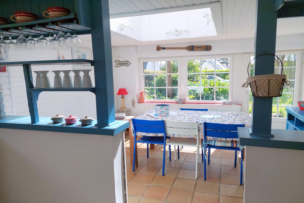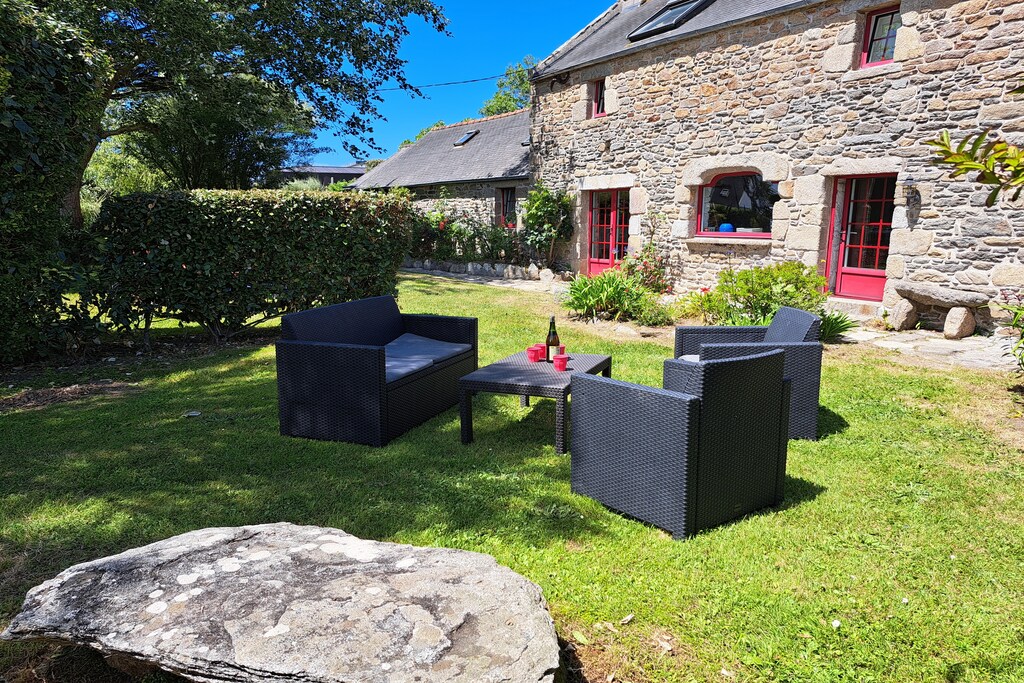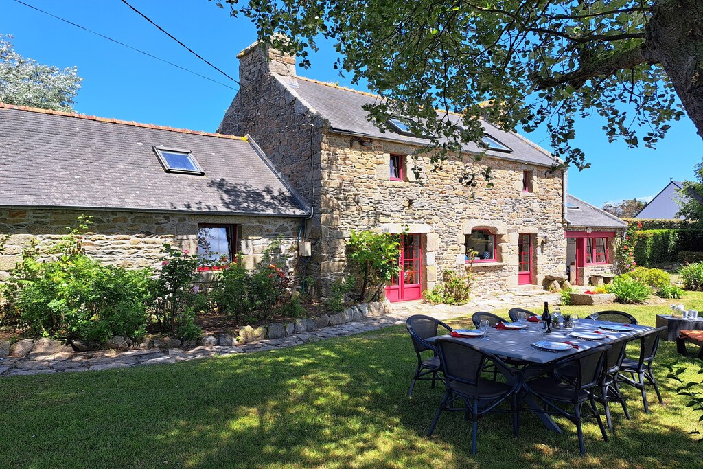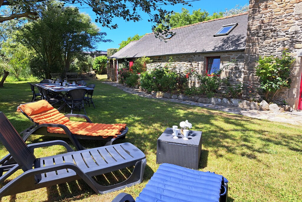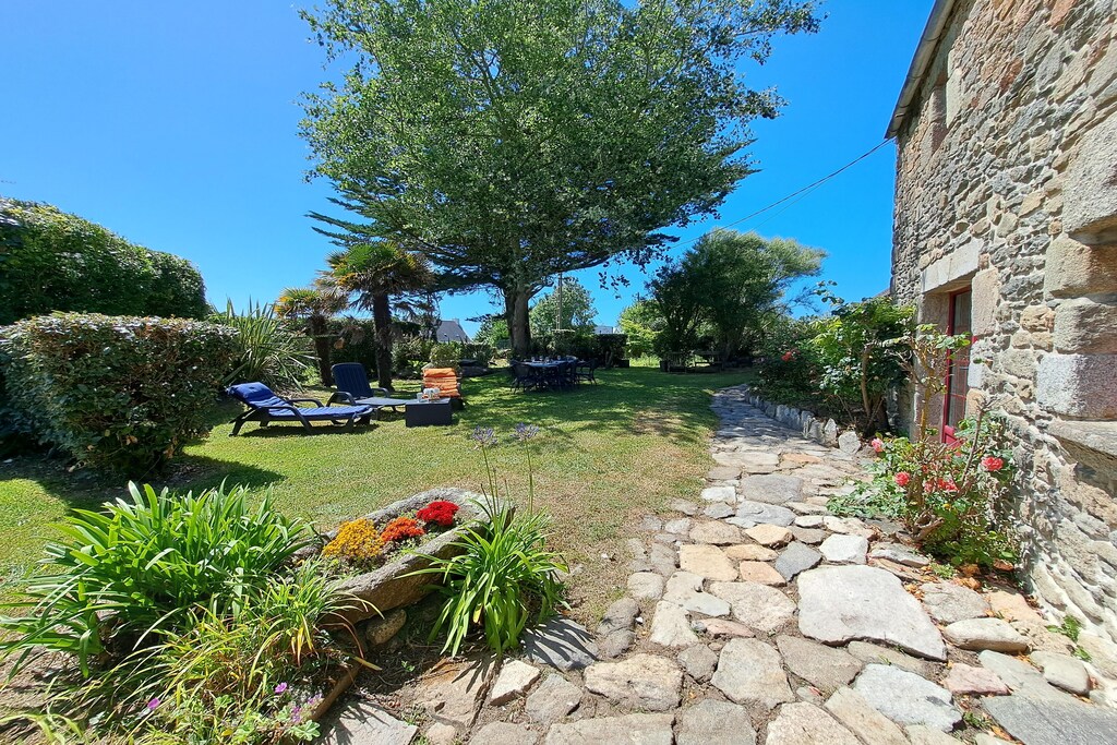 A seulement 150 m de la longue plage de baignade de Treompan et de la petite île de Carn. Le sentier pédestre adjacent conduit également les enfants rapidement et en toute sécurité à la plage de sable. La maison (XVIIIe siècle), l'une des plus anciennes maisons en pierre de Portsall, a été très joliment rénovée et meublée avec amour dans un style moderne. Des éléments tels que les murs en pierre, les plafonds à poutres en bois et la cheminée, combinés au confort le plus moderne, soulignent le caractère rustique et très chaleureux. La maison se trouve sur un grand terrain de jardin sinueux et clos avec des coins confortables et de vieux arbres fruitiers. Idéal également pour les hôtes qui souhaitent amener leur chien. Portsall est un petit village de pêcheurs juste à côté de la côte. Le littoral de cette région est composé de rochers, de dunes et de plages de sable fin. Outre les grandes plages de Treompan et de Trois Mouton, idéales pour la baignade en famille, pour le kitesurf, la planche à voile et le char à voile, il existe également de nombreuses petites baies où, en plus d'une baignade rafraîchissante dans la mer à marée basse, il existe des conditions idéales pour la pêche dans la boue. Vous rejoindrez immédiatement le GR34 qui vous permet de longer la côte sur des kilomètres.