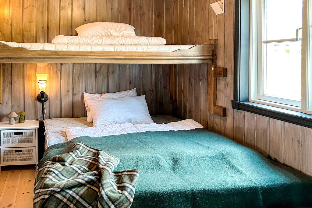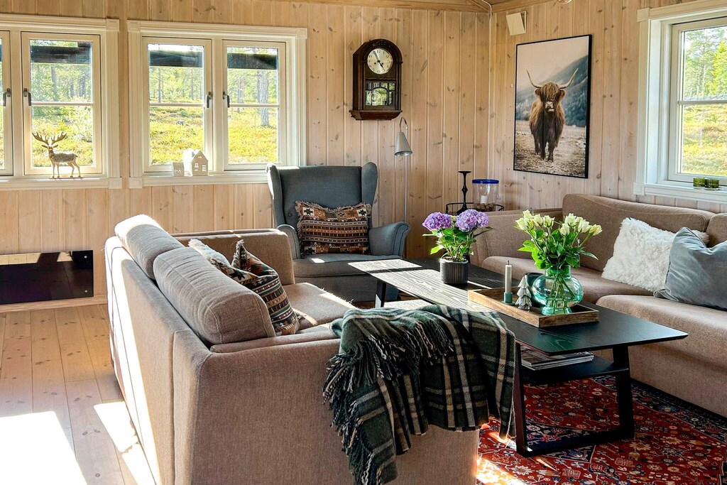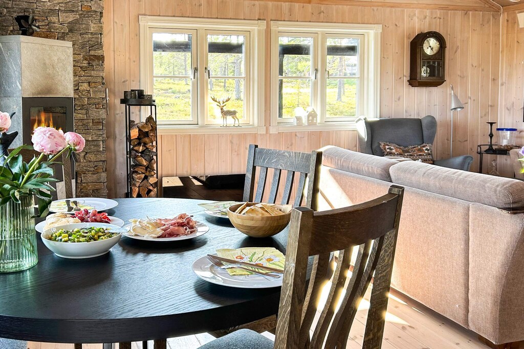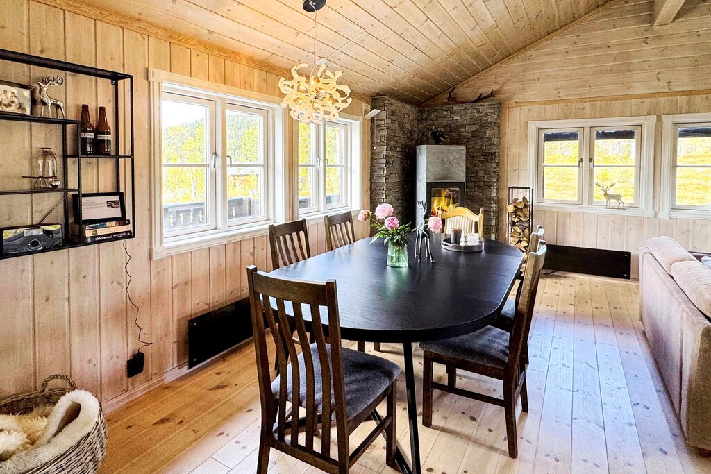 Modern and cozy cabin on two floors built in 2010. The cabin is located on Vegglifjell north, 755 masl with a view of Blefjell in the east and Hardangervidda in the west. The cottage is well equipped with all amenities. The kitchen has plenty of space and is well equipped. The TV in the living room has a chromecast that can be connected to a mobile device such as a PC, telephone, iPad, etc. Good and stable WIFI network. In the hallway, there is a large wardrobe and underfloor heating. The bathroom has ample closet space, shower cubicle, towel warmer, washing machine and underfloor heating. The cottage has three bedrooms with good beds and a loft living room. Upstairs is a living room with double sofa bed. 1 large bedroom with 2 x double beds (W: 180cm and 150cm). 1 master bedroom with double bed 180 cm and 1 bedroom with family bunk (W: 150 below, 90 cm above). Child gate is mounted on top of the stairs to the 2nd floor. WC with sink on the second floor. There are duvets that are 220cm long in the cabin. The cottage has a terrace facing west (covered) and south, about 60 sqm. Dining table with 6 chairs, lounge sofa with table and two chairs, 2 sun loungers with stool and also parasol, fire pan, gas grill and charcoal grill. From the terrace you can walk straight out to the natural plot. The cottage also has a covered south-facing balcony on the 2nd floor. Vegglifjell is in the heart of Nummedal between Kongsberg and Geilo. Here you will find great marked ski trails, hiking, and biking trails approx. 30 meters from the cottage, and it is only 2.4 km to Veggli Fjellstue on skis. Veggli Ski Center is only a short drive away (approx. 5 min) by car. There are 13 fishing lakes in the area, as well as Lågen which is a well-known fishing river. In the area, you can also find cranberries, blueberries, and mulberries. Approx. approx. 2 hours and 15 min to drive to the cabin from Oslo. From Drammen it is approx. 1 hour and 45 min. and from Kongsberg approx. 1 hour. In Lampeland and Veggli, there are fast charging stations for electric cars, including Tesla. Veggli center (approx. 10 min drive from the cottage) has a center with grocery store, café, and flower shop. In addition, you will find a petrol station, art shop, bakery and Veggli Inn with accommodation and a café/restaurant in the "center". To get to the cabin, there is a road barrier at 70 NOK, to be paid by card or Vipps.