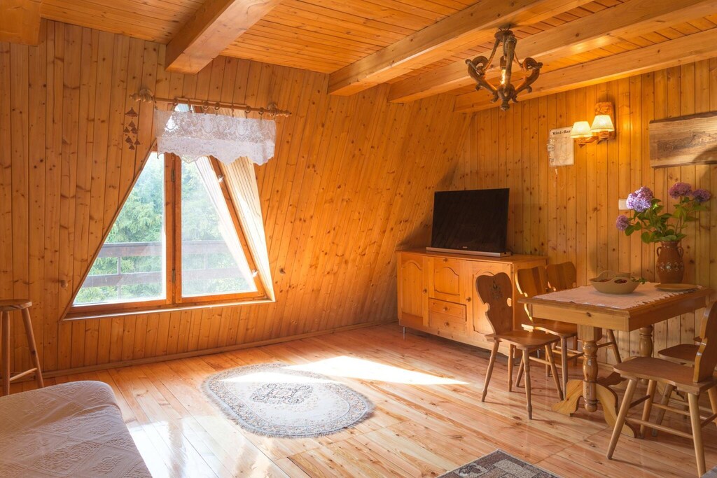 Cette confortable maison de vacances de style cachoube, sur deux étages, dispose d'un sauna et d'un grand jardin privatif. Elle se trouve à 120 mètres du lac, de la plage et du quai pour kayaks. Au rez-de-chaussée, vous trouverez un salon spacieux avec cheminée (bois fourni), table à manger, télévision et canapé-lit deux places. Le salon communique avec la cuisine. À ce même niveau se trouvent également une salle de bain avec douche, des toilettes séparées et un sauna (inclus dans le prix). L'étage supérieur abrite trois chambres indépendantes. La maison possède deux terrasses (dont une couverte) et un balcon au premier étage. Un chauffage au sol est à votre disposition. Une connexion Wi-Fi est disponible.