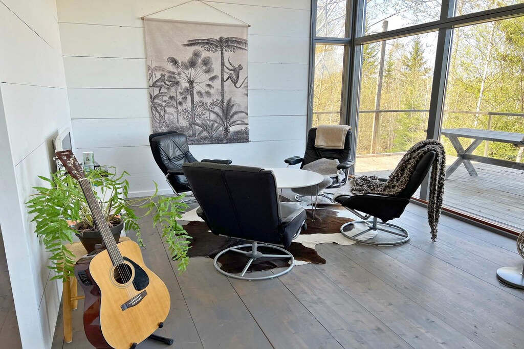 La maison comprend trois chambres, sans portes, mais avec des rideaux à tirer. La cuisine est équipée d'un lave-vaisselle, de plaques à induction et d'un plan de travail spacieux. Une salle de bain avec douche et WC se trouve dans le hall. La terrasse entoure toute la maison, vous permettant ainsi de profiter du soleil ou de l'ombre, selon vos préférences. La propriété est une parcelle forestière située en hauteur avec vue sur un étang ornithologique, où un couple de cygnes vit depuis plusieurs années. D'autres espèces d'oiseaux et d'animaux sauvages peuvent également être aperçus dans la prairie.