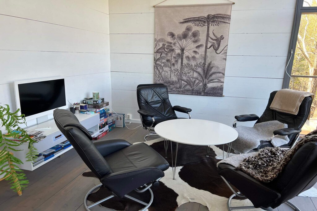 Dans cette belle maison, conçue pour les moments conviviaux, vous trouverez trois coins salon, une grande table à manger, un canapé et un coin avec quatre fauteuils confortables. Le grand salon est doté de portes-fenêtres coulissantes donnant sur une grande terrasse avec salon de jardin et barbecue. La maison n'est pas adaptée aux jeunes enfants, car la terrasse est en hauteur et est dotée d'une balustrade, mais pas sur tout le périmètre.